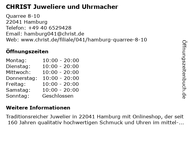 CHRIST Quarree 8-10 22041 Hamburg. 379 Alle Uhren. HamburgUhren Schmuck Filialen Adressen und Öffnungszeiten von Christ Filialen in Hamburg.