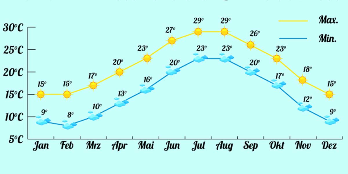 Afrika im Juli Europa im Juli Frankreich im Juli Karibik im Juli Mittlerer Osten im Juli Nordamerika im Juli Ostasien im Juli Ozeanien im Juli Südamerika im Juli Südostasien im Juli Zentralamerika im Juli Zentralasien und Südasien im Juli. Luft 20 C bis 29 C Wasser 26 C 10 Sonnenstunden.